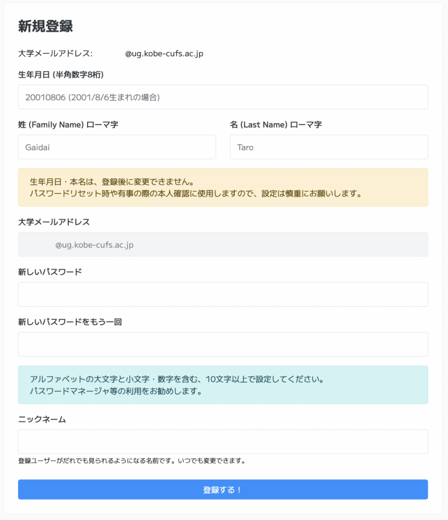 - 姓・名をローマ字表記で入力し (大学内アカウントの表記と一緒にすると良いです)
