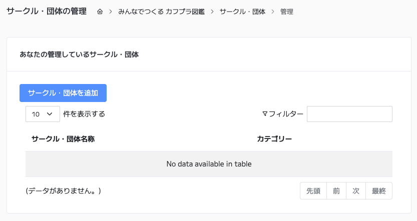 画面左側メニューより「サークル・団体図鑑」→「管理 (団体管理者用)」と進み、「サークル・団体を追加」を押下します。