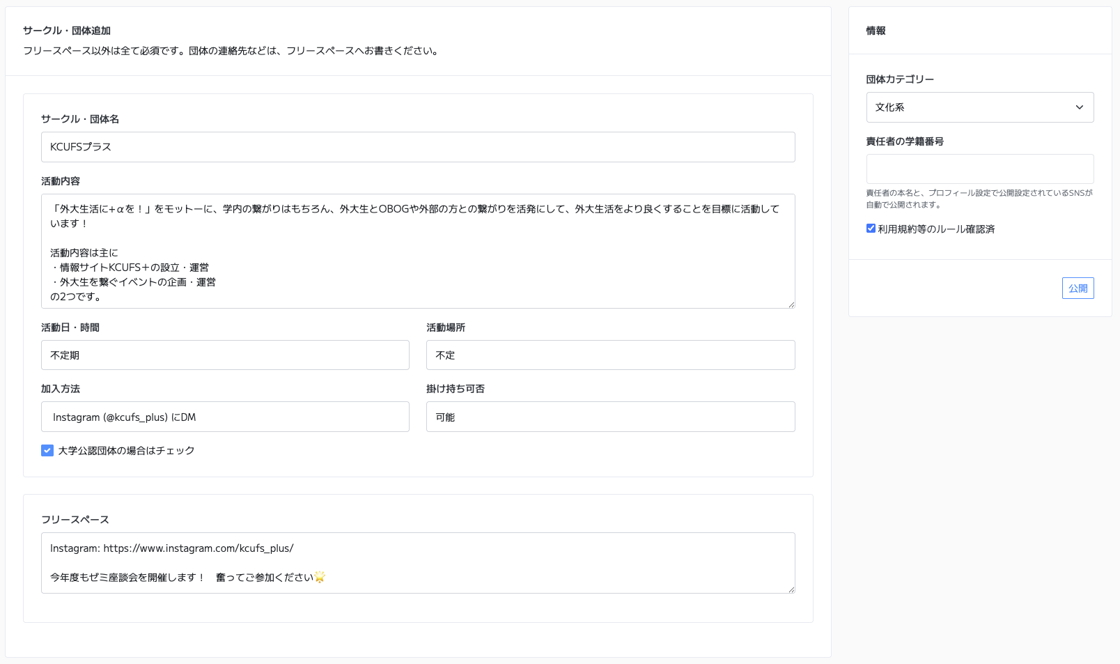 - 必要に応じてフリースペースも入力し (活動報告や、今後のイベントの宣伝、入部希望者へのメッセージなど、自由にご活用ください)