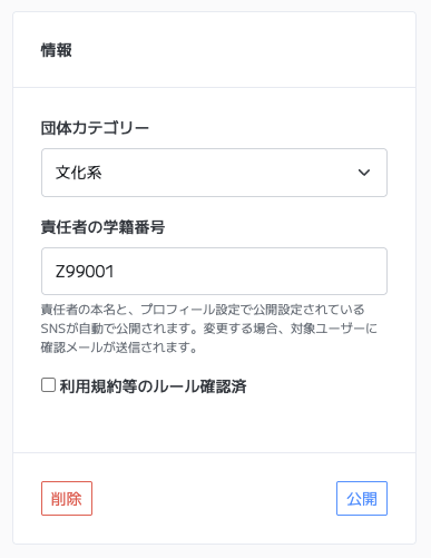 - 責任者の学籍番号を確認し (ログインユーザー以外には変更できないようになっております)