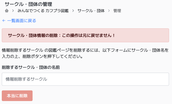 - 確認のため、削除するサークルの名前を一語一句間違えずに入力し