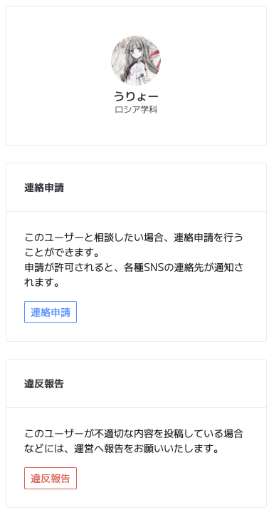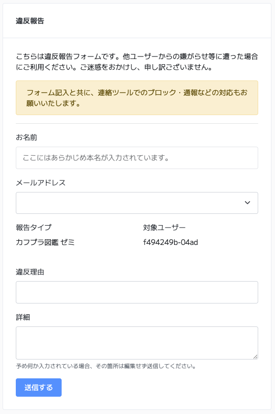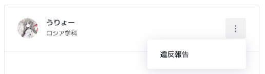 ルールに違反していたり、ハラスメントを起こしたり、イタズラ目的で使っていたりするユーザーを報告できる機能です。