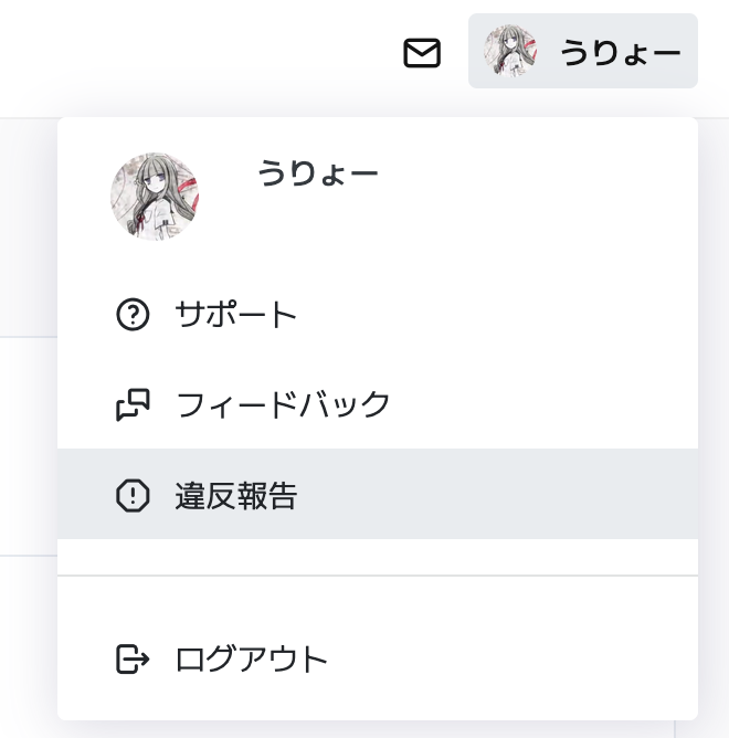 画面右上のあなたのアイコンをクリックし、「違反報告」と進むとフォームが表示されます。